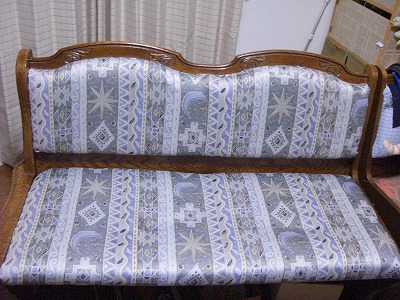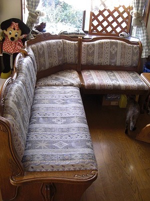 ![]() 12年越しの古びたカーテン生地もこうして貼るとなかなかおしゃれに見えませんか? カーテンの横幅がベンチよりも広いおかげで、模様をそのまま生かすことができました。 もうひとつのベンチ椅子も同じ要領で張替えを行い、残りはコーナー椅子の張替えです。 コーナー椅子の座部分は取外しができませんでしたので、背部分と同じように両面テープで貼り付けることにしました。座部分は背と同じように3〜5cmのはめ込み部分をもたせて布地をカット。 要所、要所は両面テープで押さえた上で余分な部分をはめ込んで完成です。 ![]() (いっちゃん、クンクン臭って確認中) |