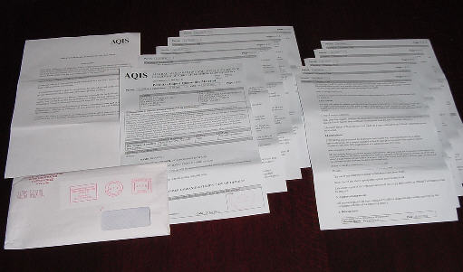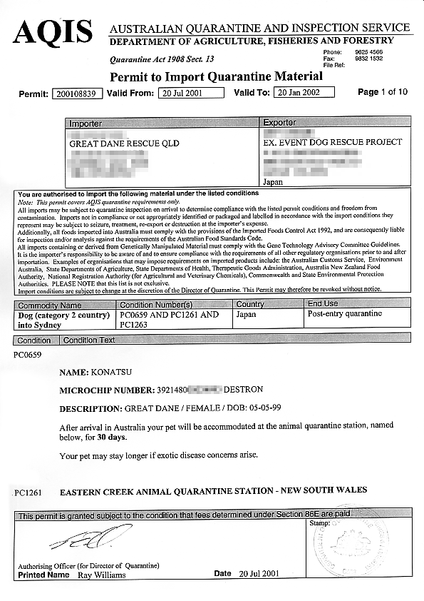 | The first page of the 10 sheets. AQIS information says that "you should note that the permit is valid for 2 months only". We found that Konatsu's Permit is valid from July 20, 2001 to January 20, 2002. Konatsu has given "6 months" long of validity! Even Kansai Air Port quarantine office people surprised at the fact. This very exceptional treatment has been approved by AQIS to Konatsu's Permit, it may be because Konatsu's exporter and importer is both a dog rescue group. |