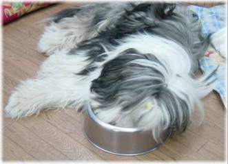 食器に頭をつっこみ、眠るももじ。