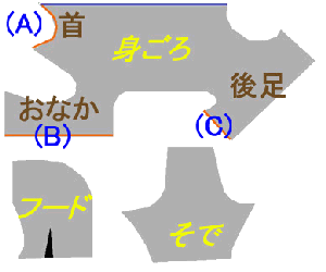 身ごろの青の線->着丈(首から尻尾までの長さ)