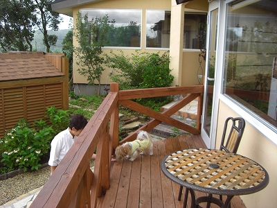 早朝、窓越しに外を見ると・・・・雨。^^; 「やっぱ、ラナ連れだと雨ははずせないか〜」と思っている間に雨は止み、青空が。 この日も1日目と同じ、数分おきに雨と晴れが変わるような天気でした。 でも、雨が降っても長く降らないので地面がビチョビチョに濡れることもなく、キャンディたちを遊ばせるのには全く問題なかったので助かりました。 ![]() 朝食は8:30なので、それまでデッキでのんびり過ごしました。 ![]() ねっ(^_^)v 晴れてるでしょ? ![]() デッキから見たお風呂。 ![]() デッキから見たお庭。 ![]() ちょうど、オーナーの奥様が出てらっしゃって、キャンディと遊んでくださいました。 ![]() ラナ「お外は気持ちがいいでしゅね」 ![]() 奥に見えるお部屋が一般の宿泊者の方が食事される処です。 吠えないことに越したことはありませんが・・・こうして離れていますので、多少、吠える子でも大丈夫かも。(^^ゞ さて、朝食の時間です。 ![]() ![]() ラナも良い子に座ってます。 ![]() テーブルには長崎の方言が書かれているシートが置かれていました。 (帰りに母親は記念にと持って帰りましたが・・・(爆)) ![]() ![]() 焼きたてです。このパンは地元、森山町で取れた小麦粉を使っているそうです。 柔らかくて・・・とってもおいしかったです。 ![]() ![]() ラナ「えへへ・・・」 ![]() ラナ「あたちもいい子でしょ?」 チェックアウトは11時とゆっくりなので、食後はまたデッキとお庭でのんびり。 ![]() ![]() キャンディ「風が気持ちいいにゃ〜」 ![]() ![]() ラナ「おかあしゃん。まだ出発しなくてもいいんでしか?」 ![]() さあ、マリティームからの眺めを堪能したら、そろそろ出発しますか。 |