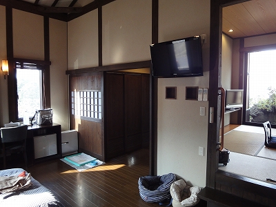 ![]() まつかぜ草の室内を紹介します。 ![]() 小笠原はバリアフリーの意識が高い宿です。 特別室は、玄関前にスロープがあり・・・ ![]() 屋外から玄関を入るまで、全てフラット。 ![]() それから、フローリングの室内に入るまで全く段差がありません。 これだったら、車椅子でも楽に入れますね。 普通だったら、デザイン的に玄関のところに2,3段の段を作りそうなところですが、全く段差をつけず完全にフラットな玄関に設計されたことは感動モノです。 ![]() 玄関の靴箱には下駄が用意されてます。 後、お風呂場とフローリングにも段差がないので、車椅子でも内湯に入りやすいようになってます。しかも、途中、曲がることなく直線でまっすぐお風呂場に入れるもの優しい設計だと思いました。 ![]() 玄関前には小型犬の足洗い場があります。小型犬の飼い主に取ってはこの高さで、しかもお湯で足を洗えることは大変助かります。・・・が、シャワーは壊れちゃったままのようでフックはあってもシャワーは見当たりませんでした。(^_^;) 洗い場に上げられない大型犬の足を洗う時、写真にあるヒシャクだとかなり不便だと思いますので、できればシャワーを修理された方がいいような気がします。(爆) (他の2室の特別室のシャワーは壊れてないのかな??) ![]() 洗い場下の扉の中には犬用のタオルと水入れが入っています。 ![]() 水入れを使ってみましたが・・・キャンディやラナには深すぎたみたいです。(^_^;) 帰り間際、荷物を片付けた後にだけ、使わせてもらいました。 ![]() 人用のタオル類はクローゼットの中にありましたが・・・トイレシートが見当たりません。 「あれ?阿蘇の小笠原ってトイレシートはサービスじゃなかったっけ??」と思いながら、持参したシートを使いました。後で和室に置いている案内書を読んだみると、シートは無料サービスですが、フロントに電話しないと持ってきてくれないようです。 無料で使えるものは何でも使う主義のちびまる家。(爆) 早速、電話をしてキャンディ達の夕食を部屋に運んでもらう時に一緒に持ってきてもらうようにお願いしました。 ![]() シートは大と小。必要であれば、トイレトレーもサービスで貸してくれます。 うちはトレイは持参してるので借りませんでした。 ![]() 玄関を入ったら、ベッドルーム。フローリングは床暖房です。 ![]() ベッド ![]() 化粧台 ![]() 洗面室のドライヤーの横に床暖房の温度調節のボタンがあります。 ![]() 2段上がったところに和室があります。 ![]() ![]() ![]() ![]() 和室でのマーキングには十分、気をつけるように・・・と書かれています。 ![]() 和室の段は高いので、犬用の階段も用意してあります。 ![]() ただ、この階段を使っても、階段からフローリングに降りる時に足が流れてしまい、脱臼するんじゃないかとハラハラしたので、実際には使わせませんでした。 (和室への上がり下がりは抱っこ) ![]() 洗面室のところには衝立がおいてありました。 「脱衣の時に利用してくださいという意味かな?」とも思いましたが、壁に固定されているわけではなかったので、広げた時に倒れそうになり、かなり怖かったです。 衝立自体もかなり重いですし・・・ これって、実際に使う人っているんでしょうか? それとも別のことで利用するんだったんでしょうか?(^_^;)