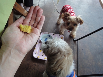 元々の計画では、湯布院で買い物に立ち寄る予定だったのですが、雨も降ってますし・・・湯布院のお店散策はキャンディたちにとって、楽しいわけでもないし・・・ ^^; 1日目は宿の庭で遊んだだけで、散歩らしい散歩もできなかったので、早めに南下して、キャンディたちを歩かせることを優先することにしました。湯布院散策はまた今度ということで。(^_-)-☆ ![]() 早めに南下すると言っても、そのまま帰路につくのはあまりにも早すぎるので ![]() まずは雨の日でも問題ない「Papi Papa」さんでお茶することにしました。 ![]() パピパパさんに来るのはかなりひさしぶりです。 ![]() パピパパさんは亡きちびまる君とも来た思い出のお店です。 ![]() ![]() そうそう、パピパパさんちのHPのリンク集には、恥ずかしながら、うちのHPもリンクしていただいてます。(^^)v 11時を過ぎてましたから、早めのランチにしてもよかったんですが、私も母も朝食で結構、お腹いっぱいになっていて、とてもランチが入りそうになかったので、二人ともケーキセットにしました。 ![]() 母はチーズケーキ。 ![]() 私はピーチケーキ。 ![]() そして、キャンディたちには「とりハンバーグ」を注文しました。 「とりハンバーグ」はホックホクで本当においしそう♪ ![]() キャンディもラナも喜んで食べてました。 今回の旅行は人にとっても、犬にとってもおいしいものを食べる旅になりましたね。