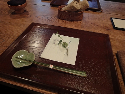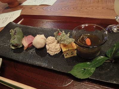 前妻は玉子袱紗焼き、鯛真子旨煮、稚鮎天婦羅、もずく酢、焼空豆、鴨西京漬け、百合根と海老茶巾