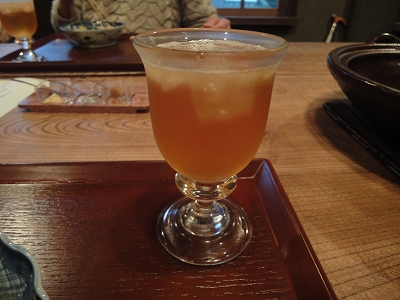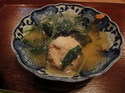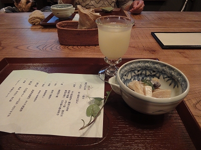 先付けは筍と椎茸の白和えです。飲み物は柚子酒。