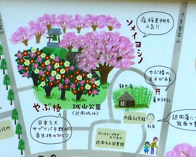 延岡花物語は3つのエリアから構成されています。 ![]() 1つめは菜の花と河津桜が咲く五ヶ瀬川沿堤防。 2つめは松山橋を渡った先にある本東寺。2月の初旬から中旬にかけて、樹齢200年を超える白梅「慧日梅」が見事です。 ![]() そして最後がやぶ椿とソメイヨシノが咲く城山公園。(拡大図) ![]() ということで、菜の花を見た後は城山へ移動するのに車へ戻ります。 ![]() 菜の花が途切れた斜面には、水仙がたくさん咲いてました。 ![]() 去年来た時は全然木気がつかなかったな〜 ![]() ![]() 城山は五ヶ瀬川から車で数分で着きます。ちなみに大手門の右横にも水仙がたくさん咲いてます。 ![]() やぶ椿はまだちらほら程度の花付きです。 ![]() 今年は寒かったせいか、花付きが遅いような気が。(^^ゞ ![]() ![]() でも、蕾はたくさん、たくさんありましたから、3月には木いっぱいに赤い椿の花が見られると思います。 ![]() まあ、キャンディにとっては、椿が咲いていようがいまいが、歩ければヨシみたいですが・・・(爆) ![]() この日は暖かかったせいか、千人殺しの横の階段を母も上がるというので上がりましたが、さすがに翌日は疲れたみたいです。だから、無理しないでって言ったのに〜(^^ゞ ![]() 駐車場にはマンサクの花が咲いてました。マンサクの花って香りがいいんですね〜 知らなかった。 |