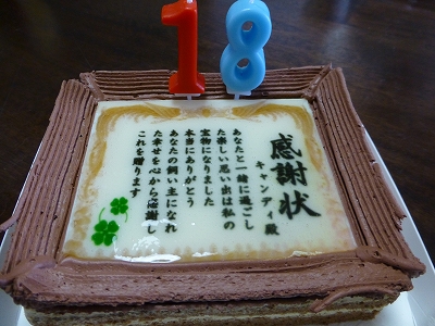![]() 去年、キャンディの17回目の誕生日。 ![]() ここで、キャンディとラナの顏をマジパンで作ってもらったケーキを用意しました。 ![]() そして、今年はキャンディの誕生日(2月5日)と49日(2月14日)を記念して、キャンディへの感謝をこめて、感謝状のケーキを用意しました。 ![]() 飼い主の私がいうのもなんですが、キャンディは本当にいい子でした。 生まれてから亡くなるまで、ただの一度も歯を見せて威嚇したことがありません。 人にも犬にも子供にも。 ![]() 17歳になるまで、要求吠えも、ほとんどしたことがなく、飼い主がダメダメな分を補うように、飼い主が何も教えていないのに、とてもいい子。その上、亡くなるまで、病気らしい病気一つすることなく、私に心配をかけることなんて、ほとんどありませんでした。 だから、頭では「キャンディとの別れは必ずくる」と理解していても キャンディが旅立つギリギリまで「キャンディは永遠に元気」とどこかで思ってました。 ![]() 18年。こんなに長い時間 こんなにいい子と一緒にいることができた事。 そんなキャンディの飼い主になれた事。 本当に心から感謝しています。 ![]() そんな思いを込めて、母と二人、 キャンディの話をしながら、感謝状のケーキをおいしく食べました。 ![]() キャンディ。18年間、一緒にいてくれて本当にありがとう。 ![]() キャンディと一緒に暮らした時間は、どこの誰にも負けないくらい 最高の時間だったと胸を張って言えます。 ![]() キャンディの飼い主になれた事・・・本当に心から感謝します。 |