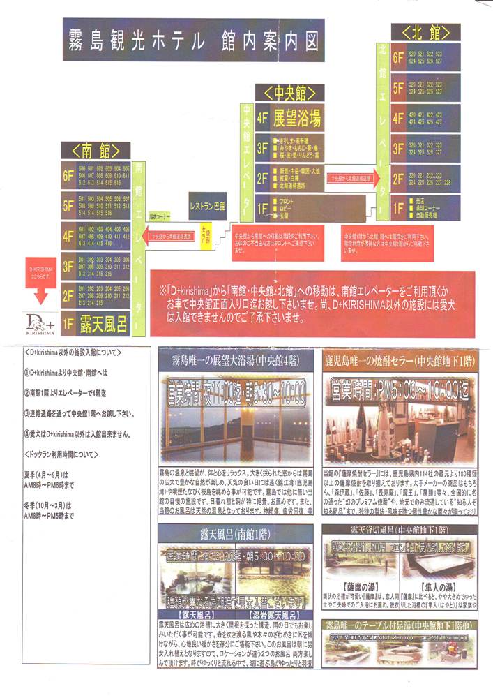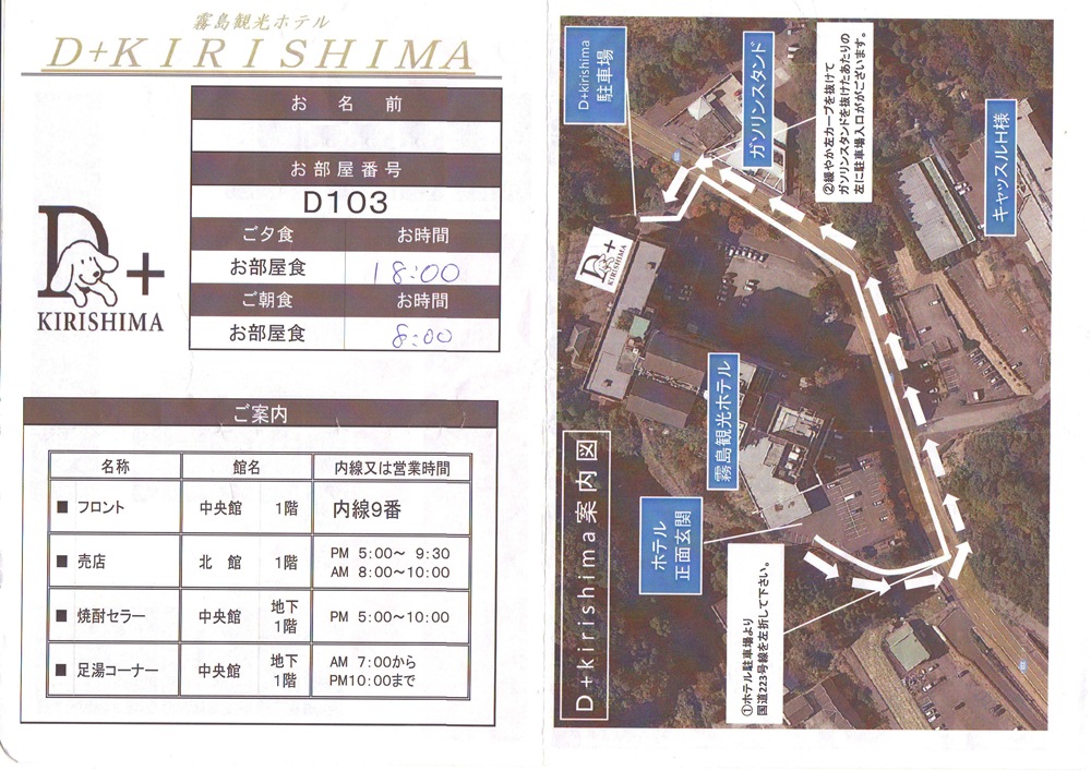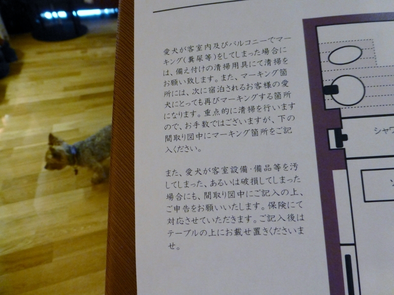 ![]() 今回の宿はペット専門宿泊客室「D+Kirishima」が23日に正式オープンしたばかりの霧島観光ホテルです。正規料金は37,800円(2人宿泊時)この中に1匹分のペット料金が含まれています。 同伴できるペット数は2匹まで。2匹目は2,160円の追加料金になります。 参考までに、予約後からの事を時系列に書いてみます。 ●宿泊2週間前 ペット連れの宿泊についての注意事項が書かれたPDFを添付した宿泊確認メールが届きました。 「ご宿泊に関するご質問などございましたら下記までご相談ください。」とメールにあったので、ホテルからの確認内容と質問事項をメールしましたが、最後まで返信は来ませんでした。まあ、別に大した質問じゃないからいいですが・・・。 ●宿泊5日前 宿泊確認の電話がきました。 <確認内容> ・当日のチェックイン方法 ・当日のチェックイン時間 ・車の車種、ナンバー、車の色 ・犬の名前(男の子、女の子)、犬種 ・犬の生年月日(年齢) ・犬の食事の有無 ・犬の苦手な食材、アレルギーの確認 ・facebookなどへの愛犬写真掲載許可 ![]() 同伴者が高齢の為、高めの浴室椅子を準備できるかを確認したところ、用意できるかどうかはわからないという返事でしたが、当日、介護用のシャワー椅子を準備してありました。 ●当日15時 フロントにチェックイン。「チェックインをしている間、同伴者は車の中でお待ちください。」と事前に聞いていたので、ラナと母は車の中で待機。 車のナンバーを事前に伝えているせいか、玄関前のスタッフの方が「○○様ですね。」と名前で声をかけられました。 ![]() フロントでチェックインをし、保険の書類にサインをしました。この時、何の保険なのか、聞き取れなかったのですが、部屋の中にある案内書の中に ![]() ↑これがあるのを見つけて、ようやく理解できました。 ![]() 室内で粗相した時は、掃除して粗相した場所をこの用紙で申告するようになっているようです。(保険で対応してくれるみたい。但し、布団も対象になるかは未確認) ただ、保険に署名はしましたが、この用紙が部屋に置いてある説明は、フロントでは一切ありませんでした。しかも案内書の内ポケットの中に入っているので、案内書を開いただけでは気が付かないかもしれません。 ちゃんと申告してほしいのか?それともしてほしくないのか? 申告して欲しいなら、もう少し丁寧に説明するべきじゃないのか? いまいち、ホテルの方針がよくつかめませんでした。^^; 予防接種(5種以上)と狂犬病の証明書を渡すとコピーを取られます。 ![]() 館内売店と夕食時の飲み物の支払に利用できる1000円のチケットと色浴衣のレンタルチケットをもらえました。 ![]() 色浴衣が借りたい方はフロントの横で借りることができます。 宿泊確認メールに添付されていた利用規約に署名するように書かれていましたが、フロントでは何も言われなかったので「利用規約への署名はしなくてもいいんですか?」と聞くと、フロントにはその準備がされてなかったようで、署名することはありませんでした。 「それではご案内いたします。」と言われたので、客室に誘導してくれるんだろうと思い、車に戻り、しばらく待ちましたが、誘導してくれる気配はありません。再び、車から降り、玄関前のスタッフの方に「案内してくれるという話でしたが・・・」と伝えると「先に館内のご案内をさせていただきます。」ということでした。 「えっ!もしかして、大風呂とかまで案内されるの??めんどくさ〜」と思いながら、再びフロントに戻ると、ロビーの柱にある館内地図で大風呂や客室から本館への通路などの説明をしてくれ、案内地図が書かれた紙を渡されました。 ![]() ![]() 「地図があるなら、サインをした時、一緒にフロントで説明すれば? わざわざ『ご案内します』とロビーの柱の館内地図で説明する必要の?」と多少、めんどくささを感じました。 ![]() その後、スタッフの車が先導して駐車場まで誘導。 ![]() 客室案内のスタッフの方とバトンタッチして、客室まで案内。 ![]() 「鍵を左に回して、そのまま押してドアを開けてください。」と説明しながら、ドアを開けようとするがドアを開けられない。鍵は2つあるので、鍵を変えて開けようとするがなかなか開けられない。(スタッフの方、かなり焦ってました) 結局、鍵が悪いわけじゃなく、言葉通り、回した状態でドアを押さなかったのが開かなかった原因でしたが、スタッフがドアひとつまともに開けられないことに少し困惑。 室内に入り、ひと通り、冷蔵庫の場所、白い方がペット用の湯船だということ、犬用のタオルは茶色、白いタオルは人用であるなどの説明を受けました。 人用の湯船には温泉がかけ流しで出てました。 すると「○△×□で安全の為、只今、お湯を止めています。」とスタッフの方。 「今、出てるのはお湯じゃないんですか?」と聞くと、「ちょっと確認します」と出ているお湯を触られました。 「お湯が出てるみたいなので、大丈夫みたいです。