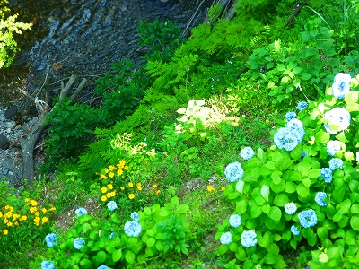 川沿いには紫陽花が咲いてます。