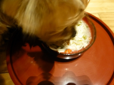 ![]() 6時になったので、レストランへ。 ![]() このレストランへの道のりが結構、母に厳しいので、足元は十分気を付けて歩かせます。 ![]() 歩きにくい階段を上がって、レストランに入り、中の階段を下るので 「上がって降りるくらいなら、下から入れるようにしてくれればよかったのに。」と母。ごもっともです。(^-^; まあ、これを建てたのは前のオーナーさんですから、仕方ないんですけどね。 ![]() 飲み物は今回も梅酒をお願いしたら、自家製の梅酒があるってことで、サービスしていただけきました。梅の香りがしっかりしていて、とってもおいしい梅酒です。 ![]() まずはサラダ。 ![]() この日のメニューです。 ![]() 前回は食事の途中でラナのご飯をもらいましたが、今回は先にもらうことにしました。 ![]() 「そう、来なくっちゃ!!!」 ![]() この日のラナのご飯は鶏ササミのご飯。 ![]() 写真を撮る間もなく、かぶりつくラナさん。 ![]() 見事、完食です。((´∀`))ケラケラ さて、飼い主さんの一の重は・・・ ![]() アサリと葱の酢味噌和え、里芋のそぼろ煮 牛肉と牛蒡の炊き合わせ、玉子焼き ![]() マグロの刺身 ![]() 地野菜の天ぷら。南小国と言えば、やはりマイタケですね。 ![]() 里芋饅頭 ![]() 刻み椎茸の餡が里芋で包まれてます。おいしかった〜♪ ![]() 馬肉の陶板焼き。馬刺しの部位ではなく、焼いて食べた方がおいしい部位だそうです。 ![]() 馬肉を焼いて食べたのは初めて。 ![]() 火が通りすぎるとすぐに硬くなっちゃうので、ピンク色くらいに火が通ったくらいで食べるのがおいしいです。 ![]() この日・・・食後、すぐに寝てくれるかと思っていたら、少し気管の調子が悪かったみたいで、ゲホゲホ咳きこんで、珍しく眠れなかったラナですが、お肉を食べる頃にはようやく眠ってくれました。 ![]() ちょっと空気が乾燥してたのかな?次回から携帯加湿を準備してみようかな。 ![]() シメはデザートは母の大好きなぜんざいでごちそうさまでした。( ^^) _U~~ |